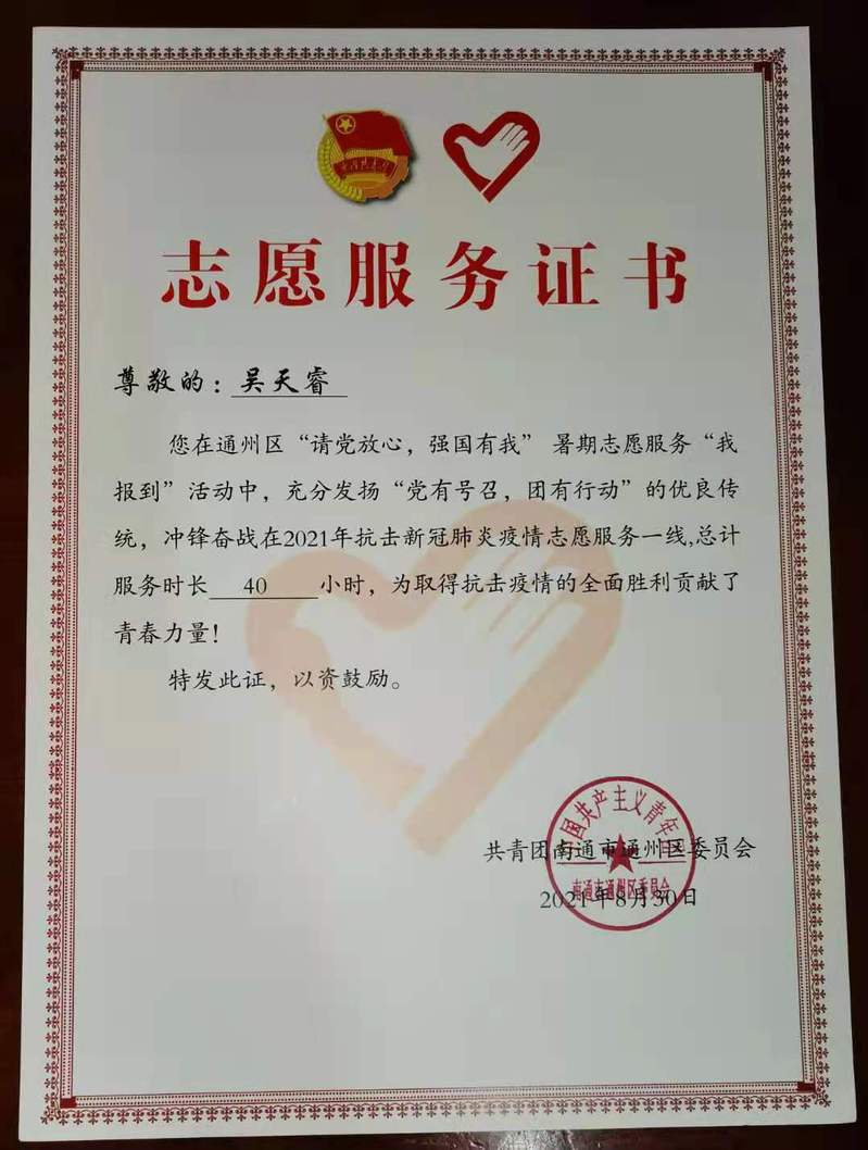 吴天睿的志愿服务证书